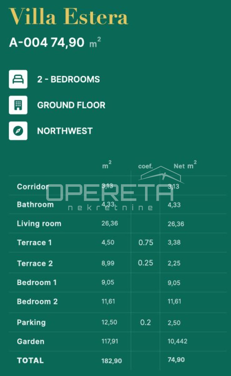 Stan E004 nalazi se u prizemlju, a sastoji se od: hodnika, kupaonice, dnevnog boravka sa kuhinjom i blagavaonicom u open space konceptu, terase 1, terase 2, 2 prostrane spavaće sobe, vrta i parkinga.