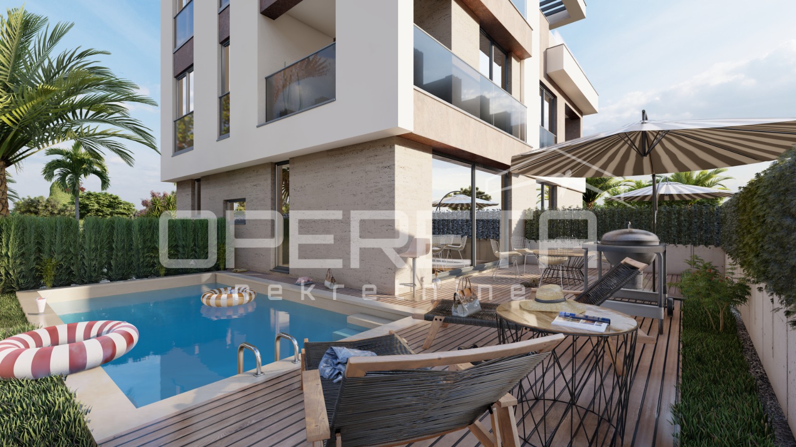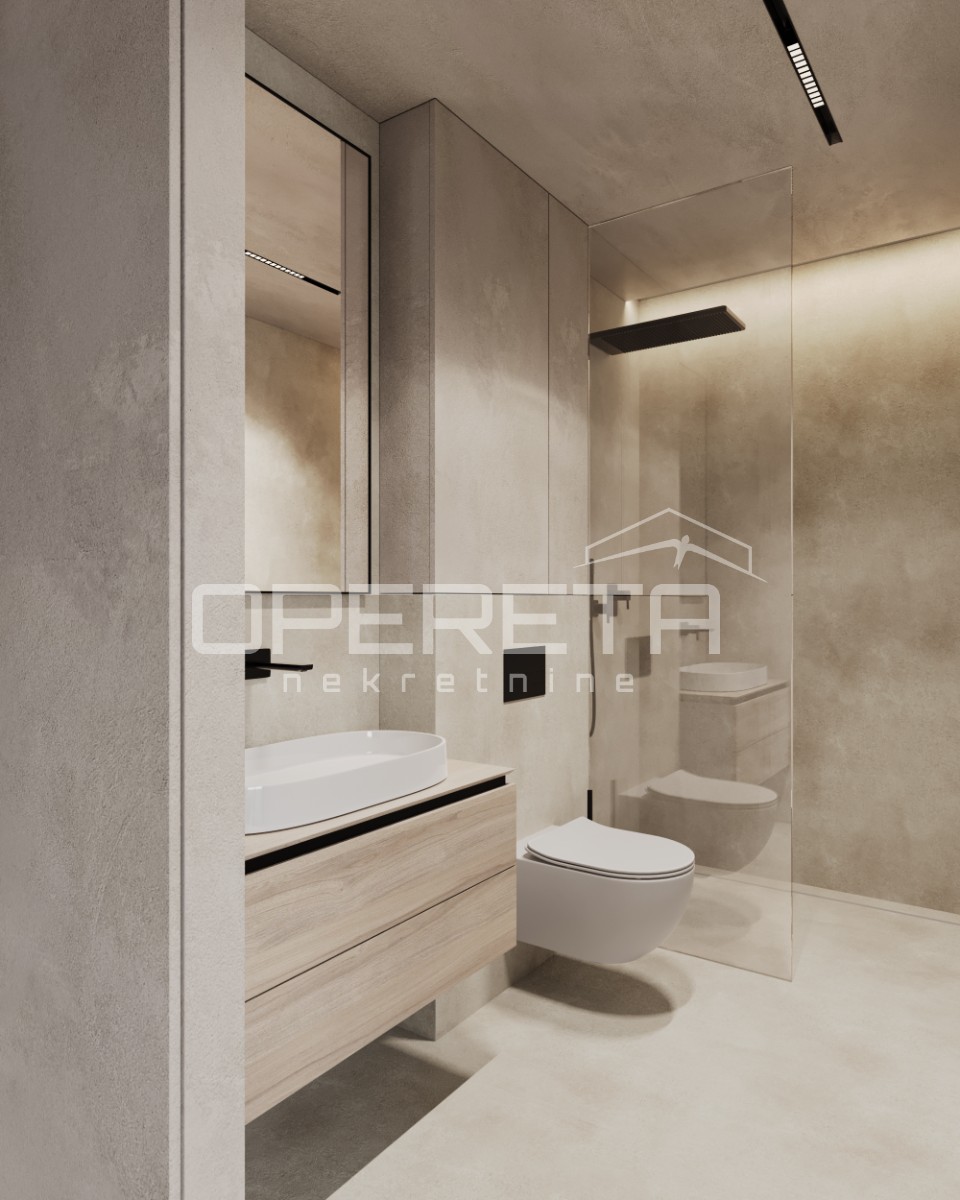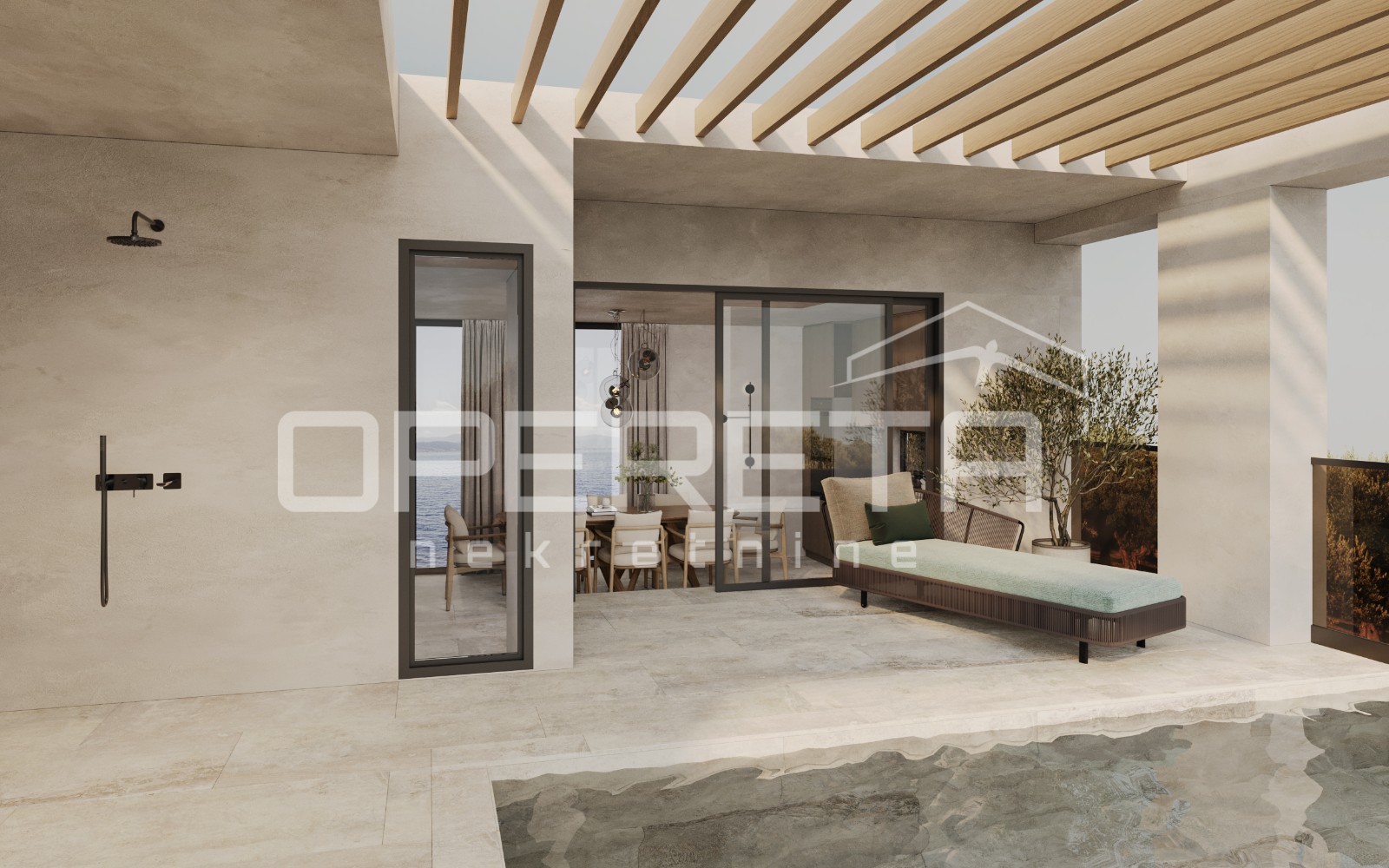 Vanjski dio čini grijani bazen, sunčalište i prostori za opuštanje koji upotpunjuju doživljaj boravka na otvorenom, stvarajući idealno mjesto za uživanje.