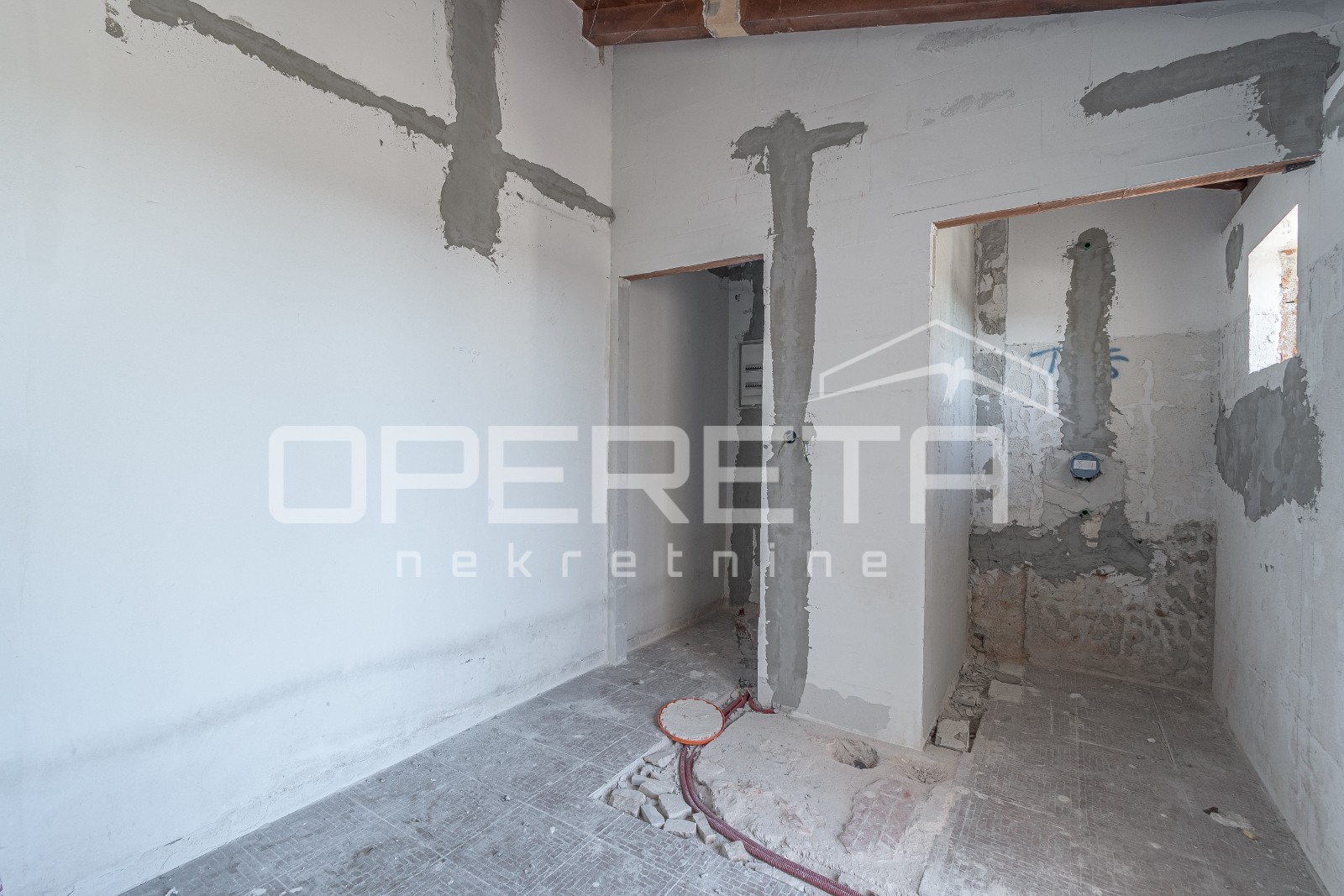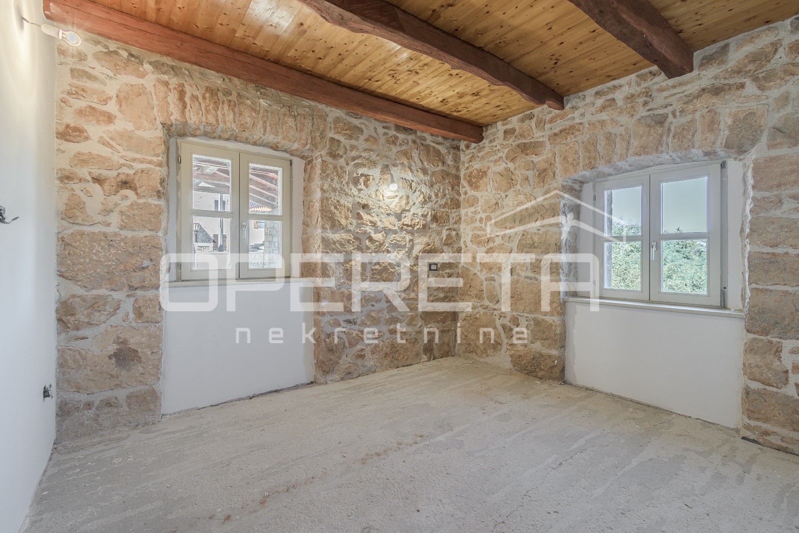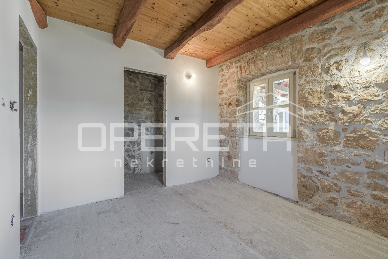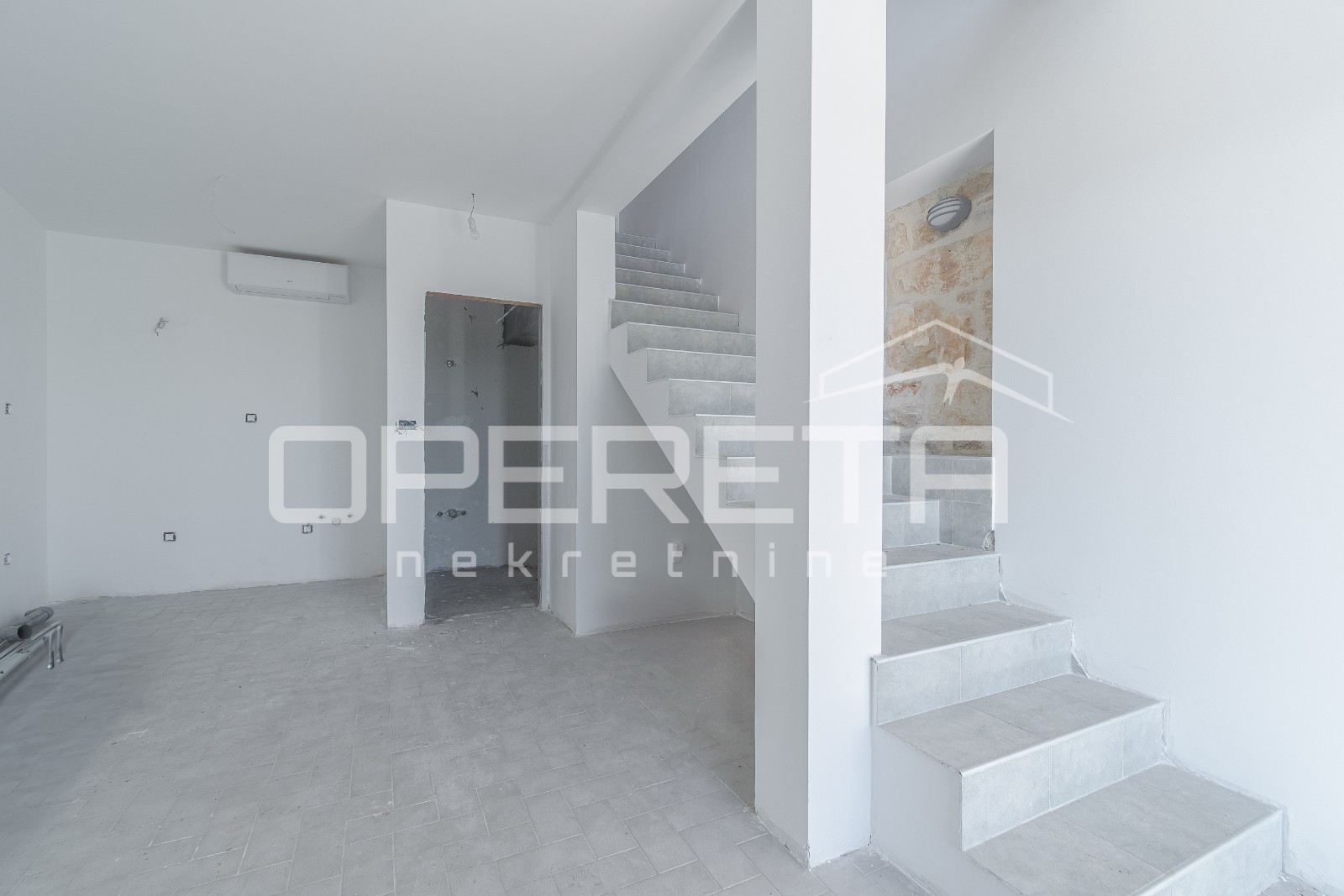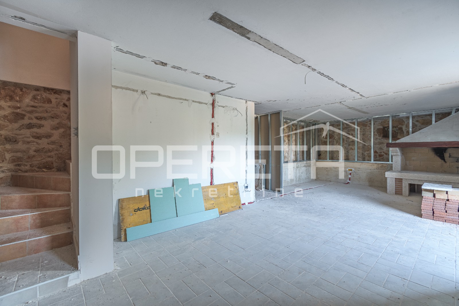 U prizemlju glavne kuće nalazi se dnevni boravak s kuhinjom i blagovaonicom, kupaonica te izlaz na dvorište s bazenom. Dodatno je u prizemlju predviđen još jedan zaseban stan s vlastitim ulazom, koji se sastoji od dnevnog boravka i kuhinje u prizemlju, dok se na katu nalazi spavaća soba s otvorenim pogledom na krajolik.