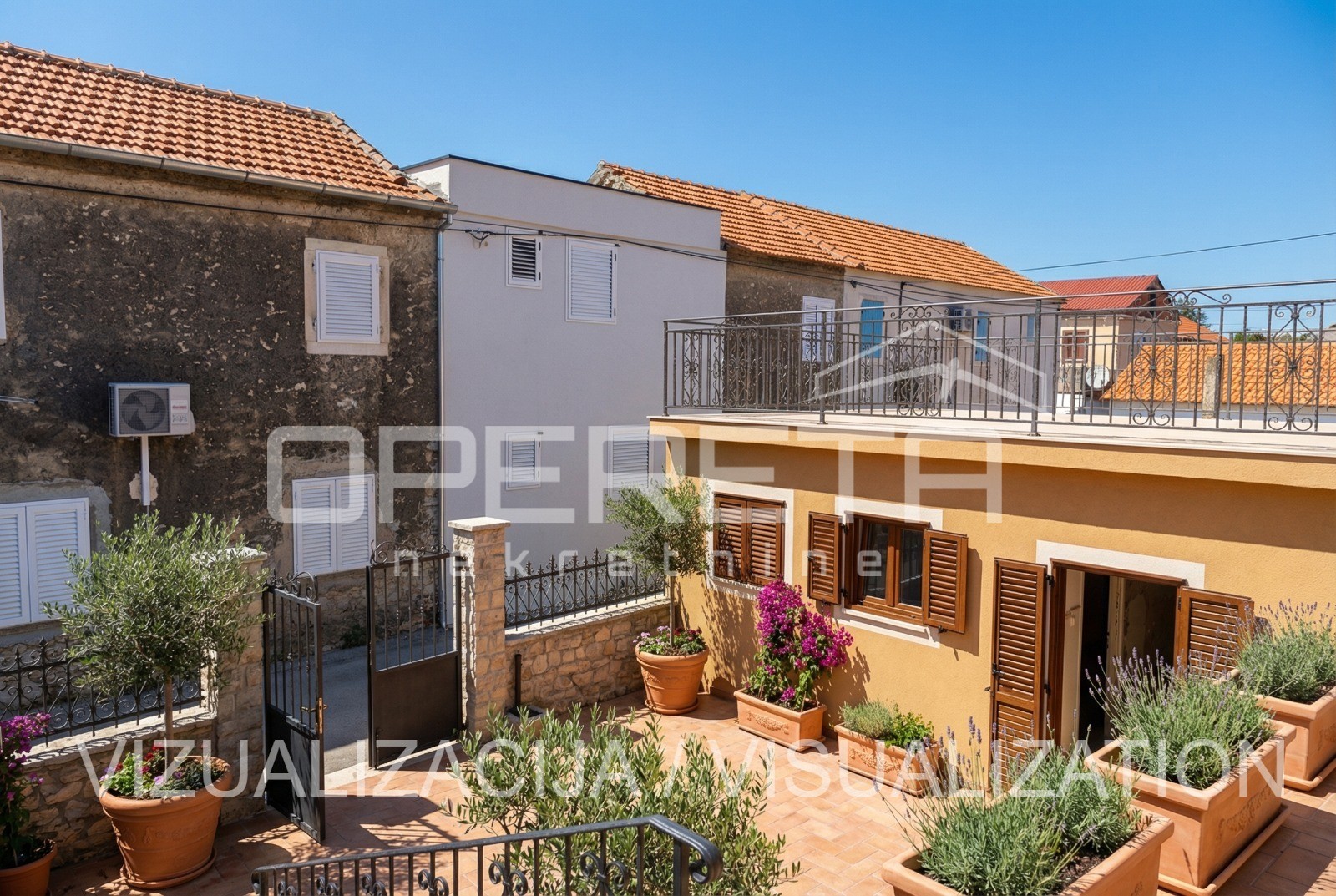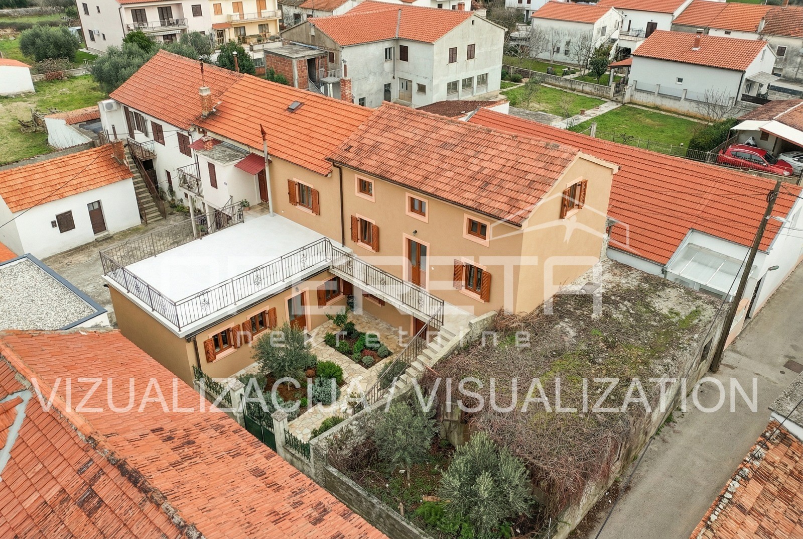 U zadarskim Arbanasima na parceli od 172 m2 smještena je kuća koja se sastoji od prizemlja i kata, tlocrtne površine 70 m2. Neto površina zatvorenih dijelova iznosi 190 m2.