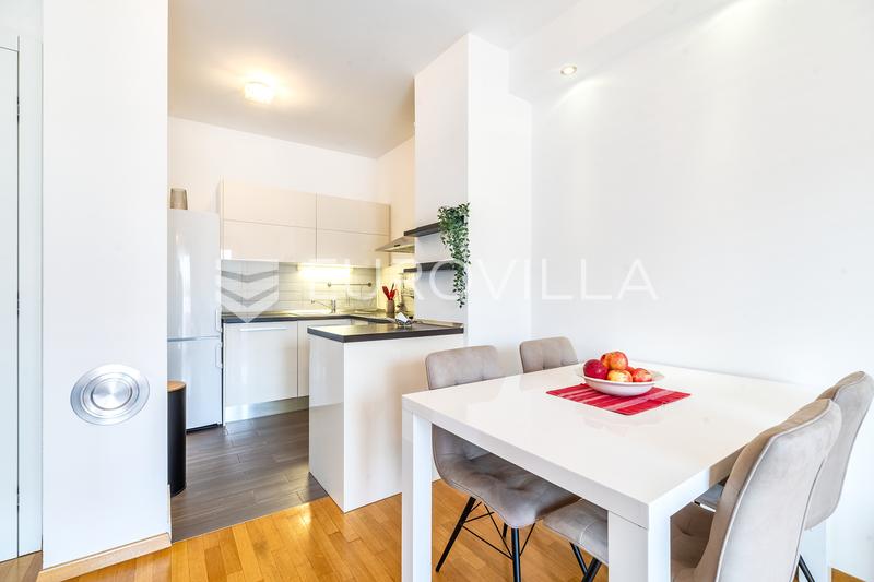 Donji Grad, Banjavčićeva, prekrasno uređen i namješten dvosoban stan površine 57 m2 na 4. katu novogradnje s liftom. Sastoji se od ulaznog hodnika, open space dnevnog boravka s potpuno opremljenom kuhinjom i blagovaonicom, spavaće sobe, kupaonice s k