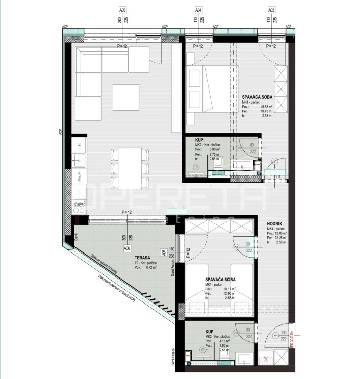 6 m² sastoji se od dvije spavaće sobe, suvremeno uređene 2 kupaonice te prozračnog dnevnog boravka s kuhinjom i blagovaonicom, a južna orijentacija osigurava obilje dnevne svjetlosti.