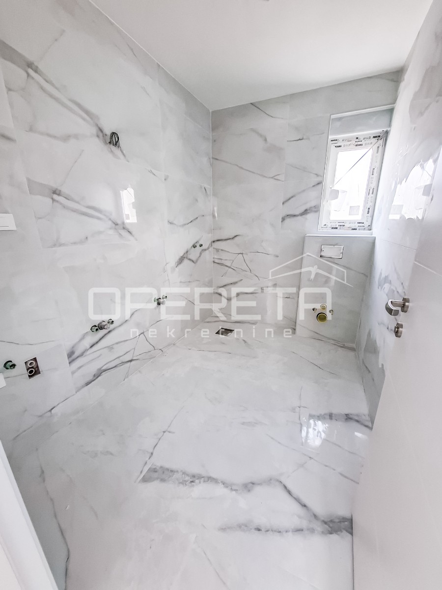 Unutarnje obloge čine španjolske pločice velikog formata (120x60 cm), visokog sjaja u interijeru, dok su na vanjskim površinama postavljene protuklizne pločice u kamenom tonu. U stanu je predviđena Mitsubishi inverter klima jedinica.
