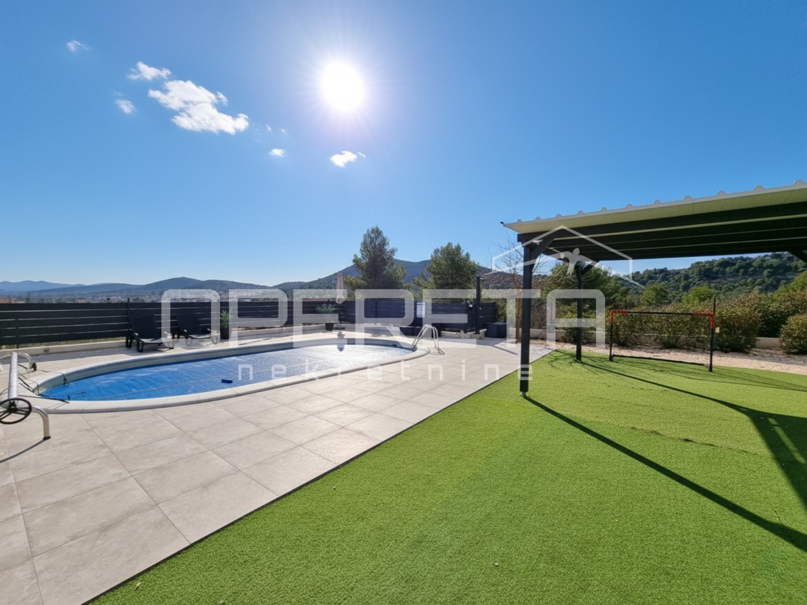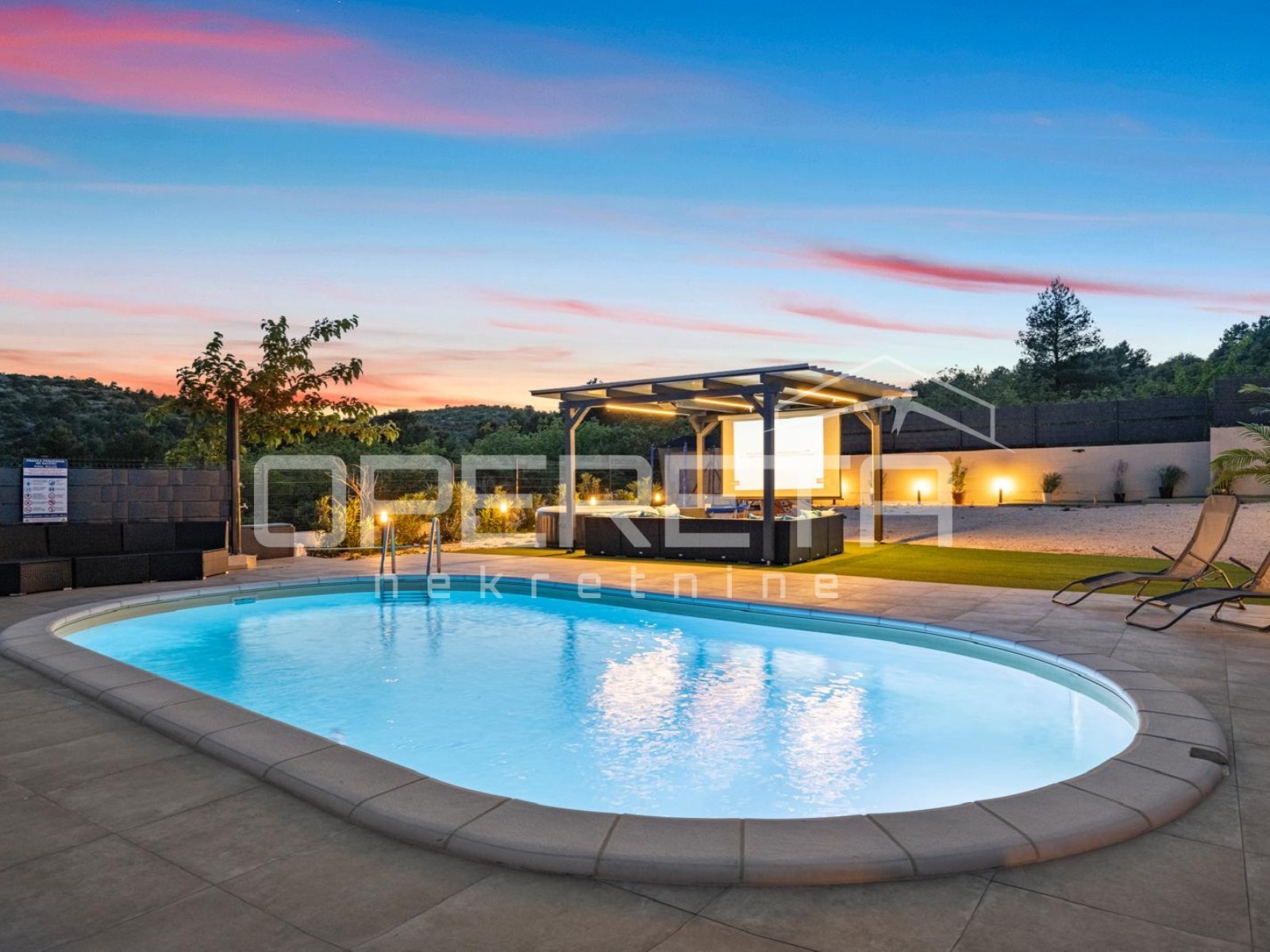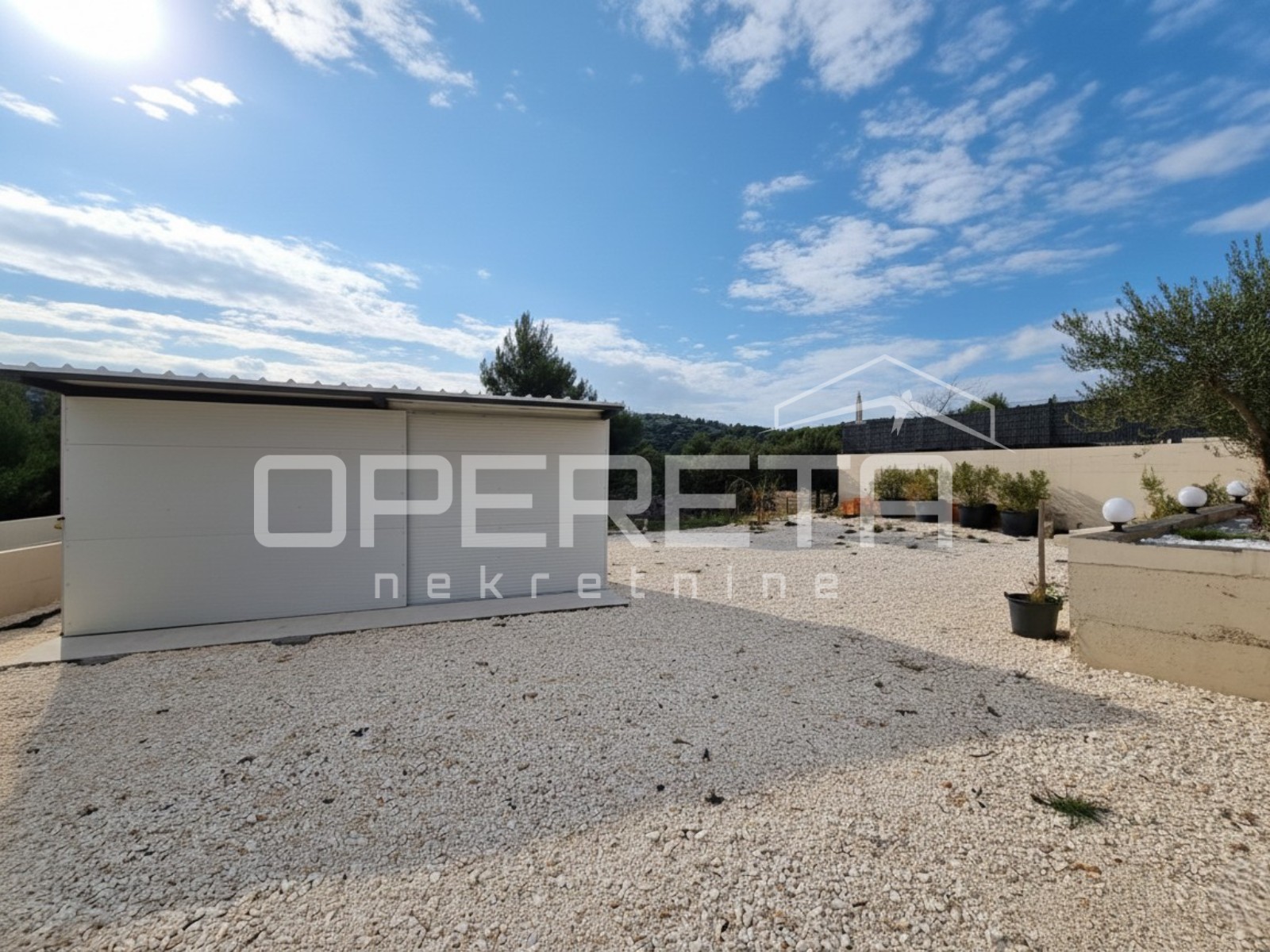 ornim zidovima i ogradom. Donji dio parcele sadrži prostranu i praktičnu kontejner-garažu, idealnu za smještaj vozila, brodice ili dodatnog skladišnog prostora. Na gornjem dijelu parcele smjestio se bazen sa sunčalištem i natkrivena terasa, sve okruženo mediteranskim biljem i oplemenjeno dekorativnim šljunkom.
